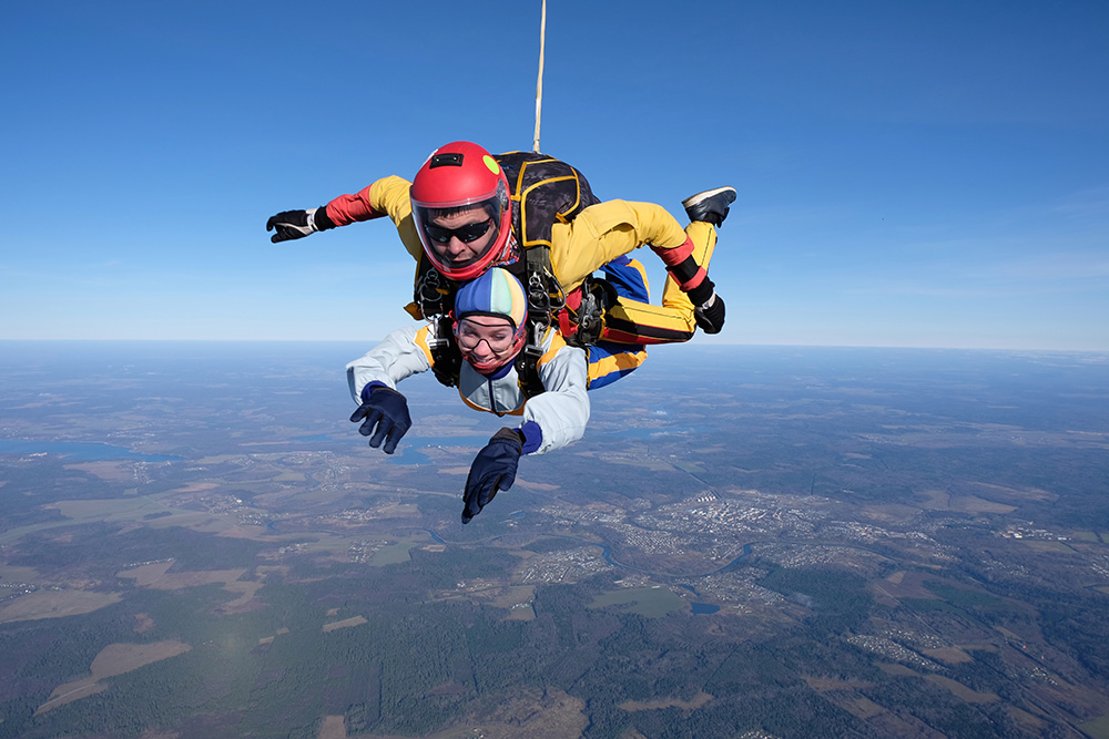 タンデムジャンプは、インストラクターと一緒に2人乗りのパラシュートで飛ぶ体験コース。